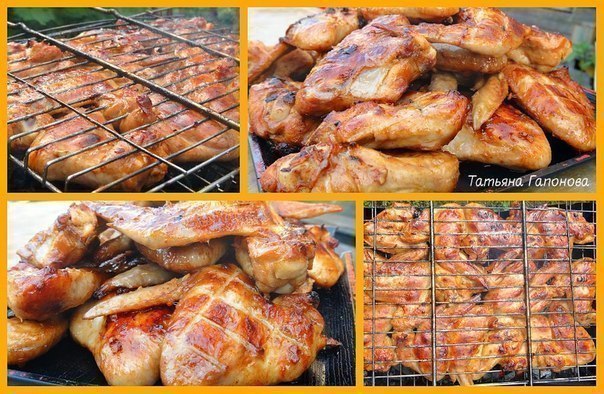 Затем замаринованные крылышки складываем на решетку. Угли должны быть не слишком сильные, иначе курочка быстро сгорит.