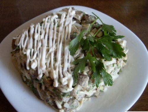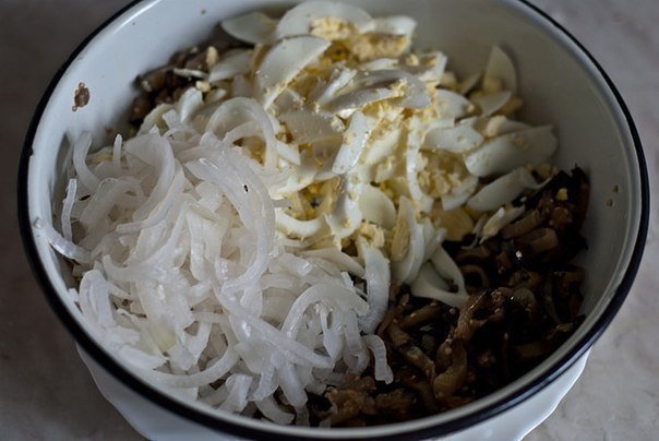 5.Складываем в емкость для салата,добавляем порезанные яйца,отжатый маринованный лук заправить майонезом.