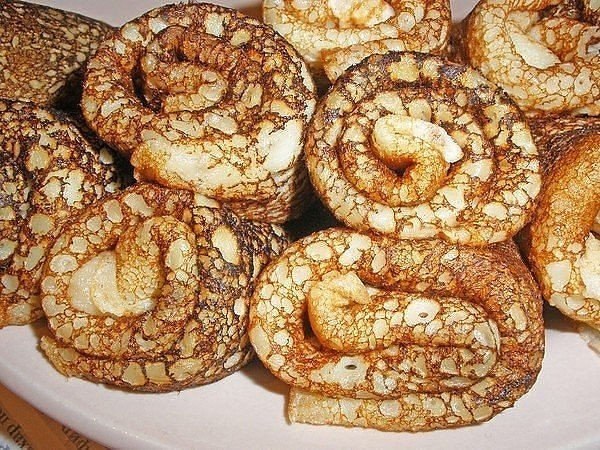 Теперь самый ответственный момент. В горячем виде лепёшки нужно свернуть с одного края. Делать это нужно быстро, пока они не остыли, иначе тесто поломается. Можно воспользоваться чистыми хозяйственными перчатками, а можно приспособиться сворачивать просто руками. Горячее бисквитное тесто очень податливое, как свернёте, так и останется. Получаются вот такие заготовки.