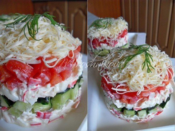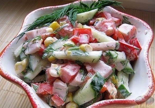 Нарежьте кубиками крабовые палочки. Выложите в салатницу.