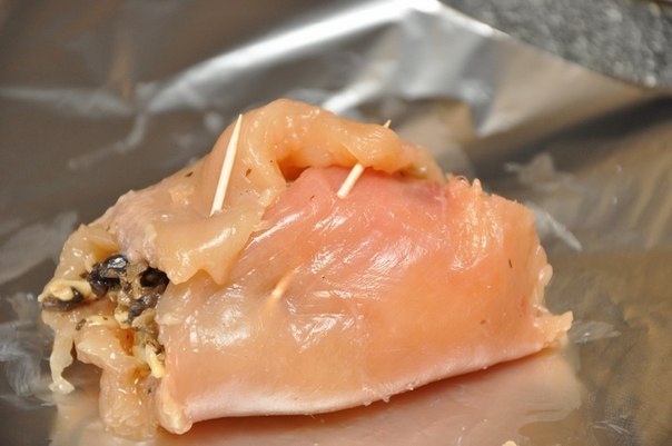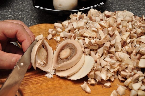 2. Куриную грудку разделываем на мелкие кусочки и тушим на слабом огне минут 20 до того пока вся жидкость не выкипит, можно слегка обжарить.