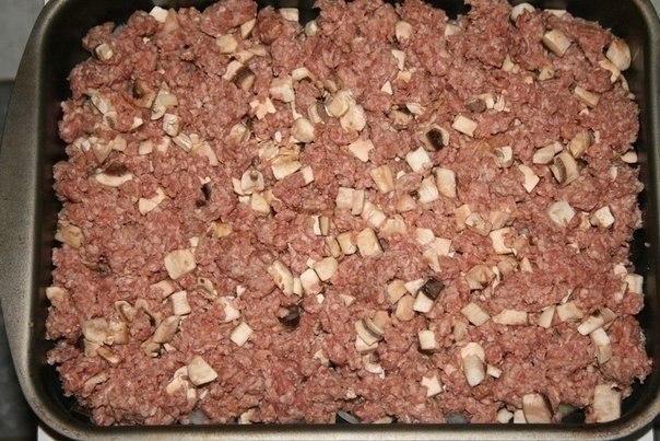 Сначала все как обычно. Поджарила лучок с морковкой. Добавила мясо, порезанное не мелко, ни крупно, соль, перчик. Поджарила его слегка, залила водой и тушила-тушила до готовности, не забывая подливать водички, когда выпаривалась...