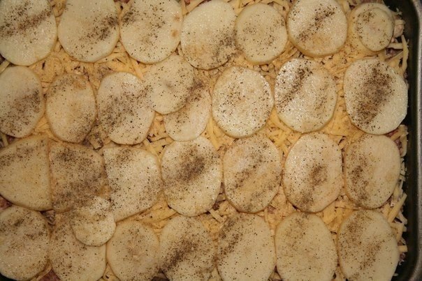 Картошку нужно пожарить отдельно. У меня была небольшая картошка, я ее разрезала на 4 части, мельче не нужно. И я ее не жарила до готовности.