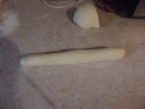 7) Тесто переложить на противень, посыпанный мукой. Смазать соусом