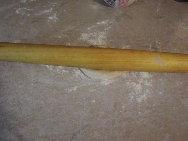 6) Тесто выложить на посыпанную мукой поверхность, разделить на две части. Раскатать в пласт толщиной 3-5 мм. При помощи большой тарелки (у меня 25 см.) вырезать круг.