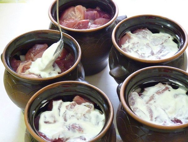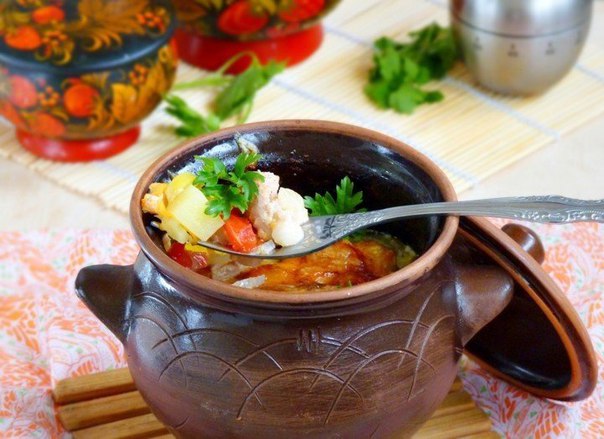 10. Налить воды вровень с последним слоем. Запекать при температуре 220 градусовпримерно 30-35 минут с закрытыми крышками. Затем снять крышки и присыпать тертым сыром, отправить горшочки без крышек обратно в духовку на 30 минут.