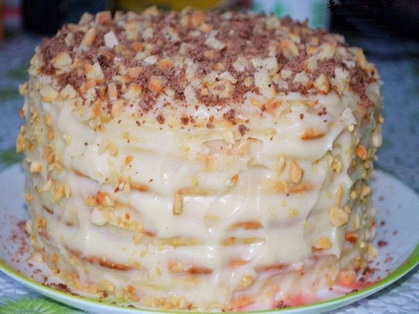 Каждый корж слегка пропитать сладкой водой или сиропом, как было сделано в рецепте торт на сковороде.