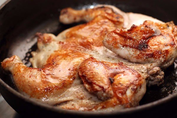 Сверху придавить каким-нибудь грузом, например, кастрюлей с водой (я придавила крышкой от казана, на нее поставила кастрюлю с водой).Жарить 15-20 минут на одной стороне.Затем перевернуть, придавить, и жарить еще 15-20 минут