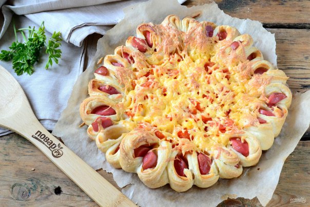 2. Раскатайте тесто до толщины 2-3 мм. Вырежьте максимально большой круг (остатки вы можете использовать для приготовления печенья к чаю) и переложите его на пергамент. По кругу, отступая от края примерно по 3 см, выложите сосиски, разрезанные вдоль пополам. Если у вас длинные сосиски, то порежьте их пополам еще и поперек.