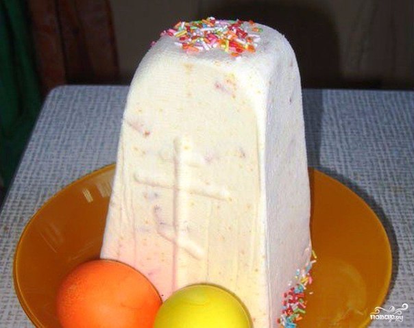 Застелите форму для пасхи марлей и выложите в неё творожную массу. Поставьте в холодильник под груз на несколько часов до полного застывания. Готовую пасху выньте из формы и украсьте по желанию.