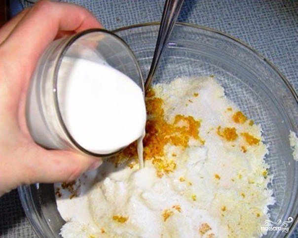 Снимите цедру с апельсина, смешайте её с творогом, сахаром, сливками и взбейте.