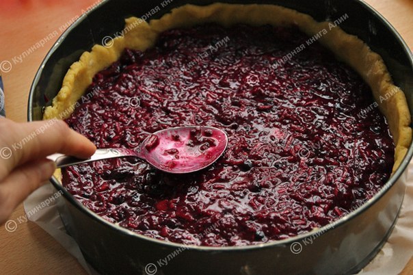 Теперь добавим сахар(сахара по вкусу. В оригинале нужно 160 г сахара. Смотрите по своим ягодам - если они сильно кислые, то добавьте 160 г, если сладкие, то 120 г достаточно, а то начинка будет похожа на варенье). Перемешать.