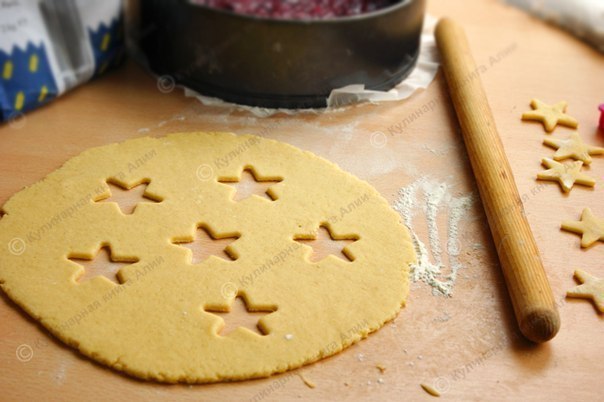Раскатать второй кусочек теста диаметром 25-26 см. Вырезать формочкой фигурки (можно стаканом). Одну в центре и пять вокруг.