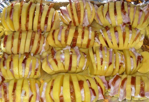 В каждый разрез вставить по ломтику бекона, можно чередовать бекон с сыром, ну или бекон с дольками шампиньонов.