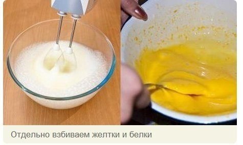 4. Пока тесто стоит, необходимо отделить белки от желтков. 2 белка надо отложить на глазурь, всё остальное – пойдёт в тесто (желтков получится на 2 больше, чем белков). Желтки растираются с сахаром и ванилином. Белки с небольшим количеством соли взбиваются до получения пышной пены.