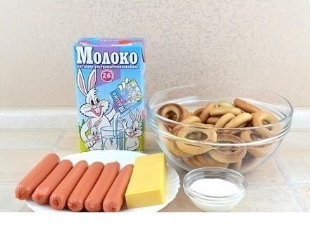 Необычное блюдо из обычных продуктов. Сушки размокают и становятся мягкими. Такое блюдо очень просто готовится, его с легкостью могут приготовить даже дети. Самое главное, чтобы размер отверстий в сушках был не меньше диаметра сосисок.
