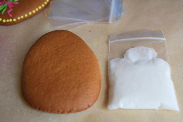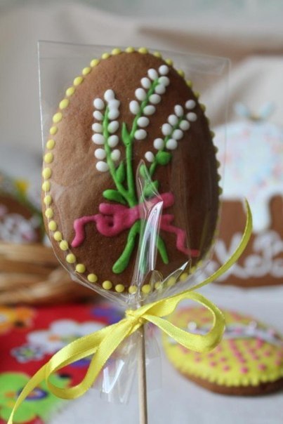5. Наполнить глазурью кондитерский корнетик (я использую пластиковые пакетики с защелкой), отрезать уголок и украсить остывшие прянички.Пряники могут быть самыми разнообразными: в форме яйца, кулича, зайца и пр. К изготовлению таких пряничков можно привлечь детей - будет интересное и развивающее занятие.Готовый пряник можно упаковать в прозрачную бумагу (делать это следует через пару часов, после того, как глазурь полностью высохнет), завязать ленту и преподнести в качестве пасхального подарка друзьям, родственникам, коллегам.