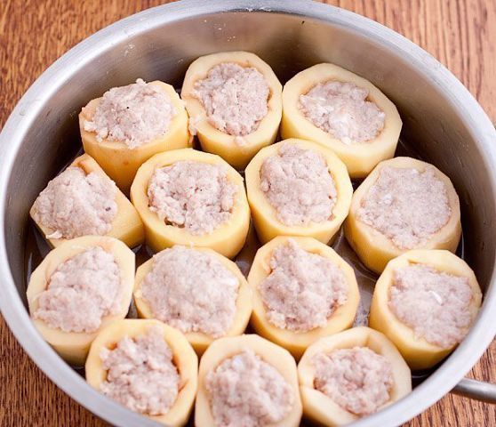 Подбираем картошку одинакового размера. Вырезаем из нее серединку (это можно сделать используя нож и чайную ложку). Донышко картофелин немного срезаем, чтобы они были устойчивы в сковородке (или сотейнике).