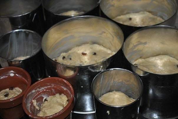 Вымешивать мягкое, вязкое тесто, макая руки в подсолнечное масло. Поставить на расстойку на час-полтора, пока оно не увеличится вдвое. Накладывать 1/3 часть формочек, подождать пока подойдет почти до краев и выпекать при тем-ре 180 гр. до готовности. Верх остывших куличей смазать глазурью, украсить.