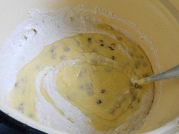 Когда тесто подойдет, добавить туда яично‐сахарную смесь.
