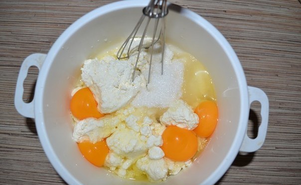 Сначала творог смешаем с сахаром, ванилином и яйцами.