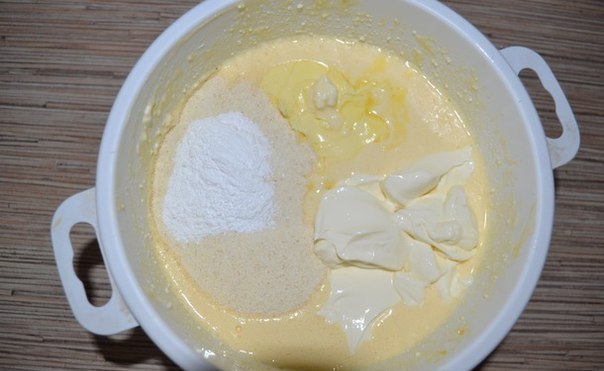 Затем добавим масло, манку, разрыхлитель и сметану. Тщательно перемешиваем до однородности.