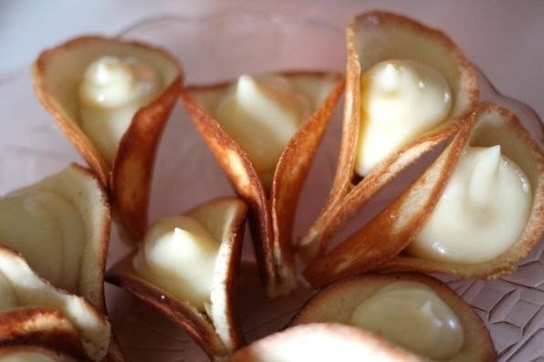 Теперь самый ответственный момент. В горячем виде лепёшки нужно свернуть с одного края. Делать это нужно быстро, пока они не остыли, иначе тесто поломается. Можно воспользоваться чистыми хозяйственными перчатками, а можно приспособиться сворачивать просто руками. Горячее бисквитное тесто очень податливое, как свернёте, так и останется. Получаются вот такие заготовки.