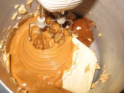 Растереть (я взбил миксером) масло и варёную сгущёнку.