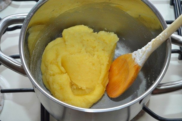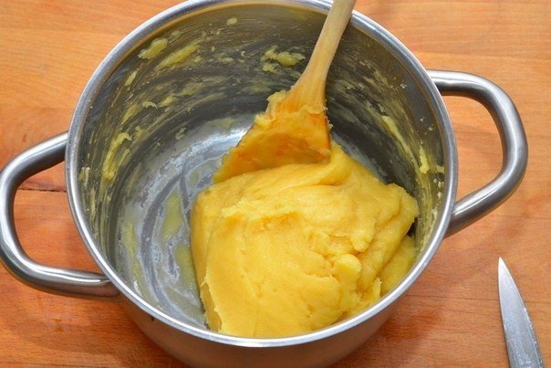 Тесто должно хорошо остыть, чтобы добавляемые яйца не свернулись.