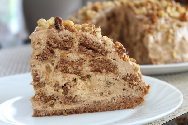 4.Нарезанные кусочки смешать с кремом и орешками(оставить немного) и выложить на корж(основу),сверху посыпать орехами.