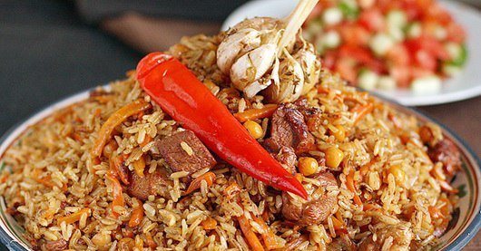 9. Когда основная часть воды впитается, возвращаем чеснок в середину, посыпаем рис слегка растертой зирой и плотно закрываем крышкой. Если плотной крышки нет, можно накрыть плов перевернутым блюдом, а уже сверху — крышкой. Огонь нужно уменьшить до слабого и оставить на 20–25 минут.