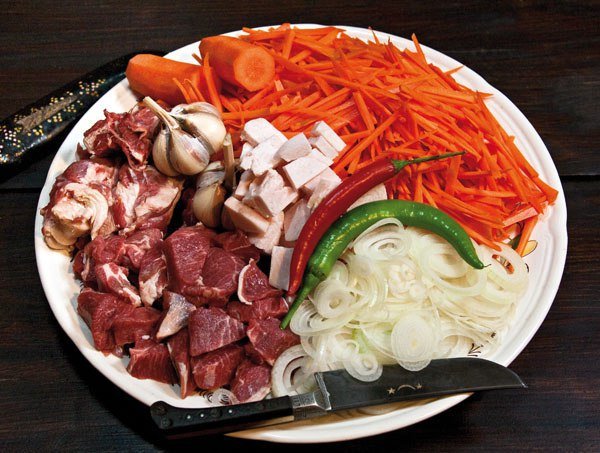 2. На хорошо разогретую чугунную сковородку (казан) налейте масла и дайте ему нагреться. Лук, опущенный в масло, должен вызывать бурление масла. Жарьте лук на большом огне до золотисто-коричневого цвета. Из него должен уйти сок.