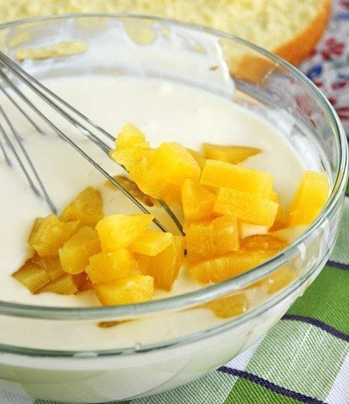 Творог смешать со сливками, сахарной пудрой и хорошо взбить в блендере. Желатин нагреть до растворения и смешать с творогом. Добавить ананасы.